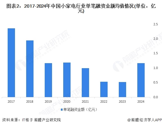 从单笔融资金额来看,2017-2024年以来单笔融资金额呈现下降趋势。2024年单笔融资金额均值有所提升,为1.2亿元/笔。