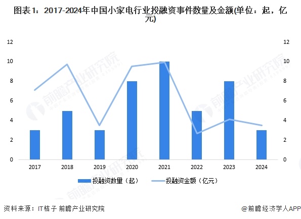 2019-2024年,中国小家电行业投融资市场经历了热度上升和下降。2021年,我国小家电市场投融资达到顶峰,之后市场开始出现降温。2024年,我国小家电市场投融资数量与融资金额较上年大幅下降,融资事件3件,融资金额约3.5亿元。