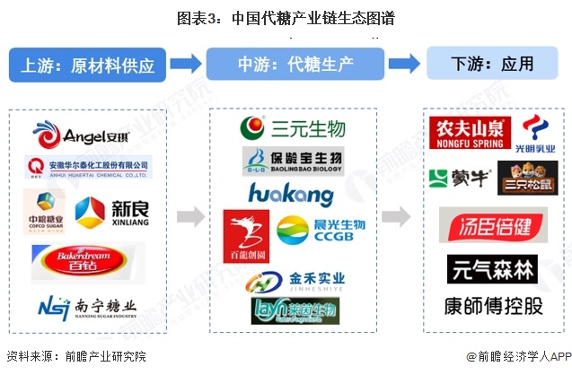 代糖上游原材料供应商主要包括安琪酵母、白钻、新良、华尔泰等企业;中游代糖生产企业主要三元生物、保龄宝、华康股份、百龙创园、晨光生物、金禾实业、莱茵生物等;下游应用领域的代表性企业有农夫山泉、光明、蒙牛、元气森林食品饮料企业,汤臣倍健保健品企业等。
