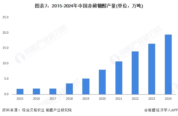 赤藓糖醇的工业化生产始于上世纪90年代初的日本,并逐渐扩展至全球。目前,中国已成为全球最大的赤藓糖醇生产国。2023年,中国赤藓糖醇产量达到16.4万吨,占全球总产量的相当比例。2015-2022年的复合增速为48.9%,表明过去几年中国赤藓糖醇产业经历了高速增长,逐渐在全球市场中占据了主导地位。初步估算,2024年中国赤藓糖醇产量约为19.4万吨。