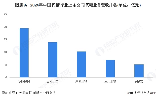 2024年,中国代糖行业上市公司中,华康股份代糖产品营收规模超过19亿元,排名第一。保龄宝、莱茵生物和三元生物代糖产品营收均超过5亿元,位列第2-4位。