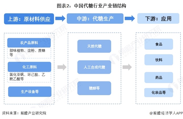 代糖的原材料主要包括甜味植物、淀粉、蔗糖、化工原料、生产设备等。行业中游为代糖生产企业;下游应用领域主要为食品、饮料、药品、化妆品等领域。