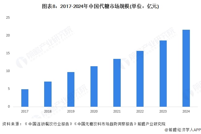 无糖饮料和无糖烘焙是代糖产品使用较多的领域。参考气森林无糖饮料代糖价值占比在7.2%左右以及21cake无糖烘焙代糖价值占比为0.82%左右,结合《中国连锁餐饮行业报告》中烘焙市场规模数据、《中国无糖饮料市场趋势洞察报告》中无糖饮料等数据测算中国代糖市场规模。2017-2024年中国无糖饮料和无糖烘焙用代糖市场规模保持增长,2024年达到21.6亿元。