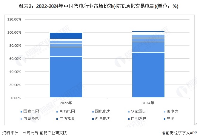 从售电行业市场份额来看,2024年国家电网市场化交易电量约占全社会市场化交易电量的70%,南方电网占16%。2022-2024年,国家电网、南方电网、国电电力、华能国际、粤电力等企业市场占比均有所提升。