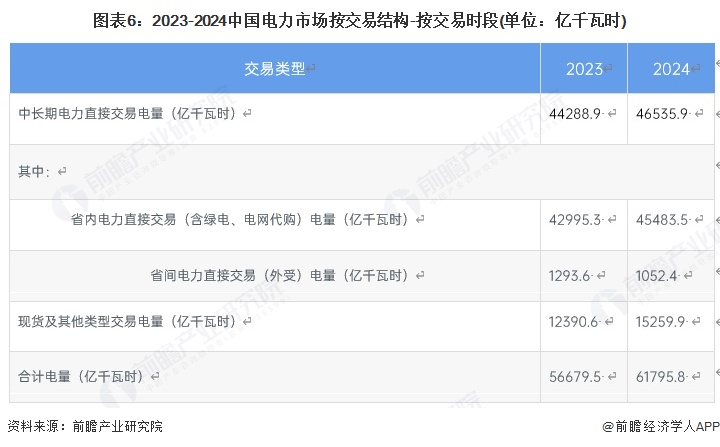2024年,全国电力市场中长期电力直接交易电量合计为46535.9亿千瓦时,同比增长5.1%,其中,省内电力直接交易(含绿电、电网代购)电量合计为45483.5亿千瓦时,省间电力直接交易(外受)电量合计为1052.4亿千瓦时。