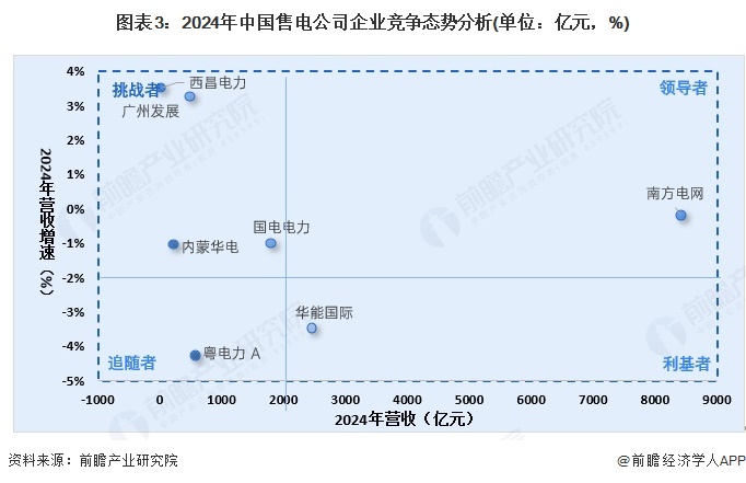 根据2024年企业营收及增速情况进行分析售电市场参与者的业绩情况,市场上的领导者是国家电网、南方电网。其次是挑战者西昌电力、广州发展、内蒙华电和国电电力。追随者是粤电力,利基者是华能国际。