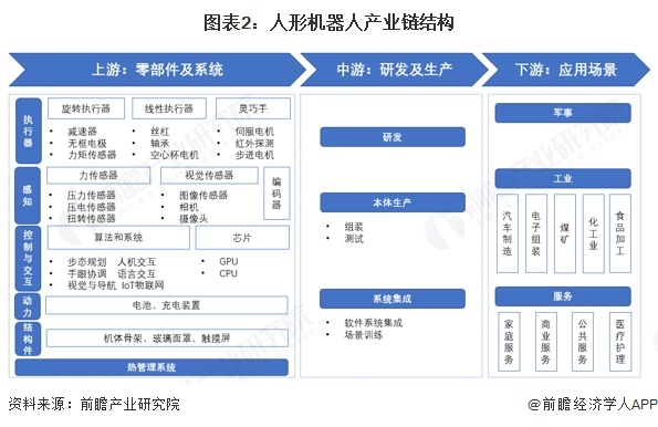 人形机器人产业链上游为零部件及系统,包括执行器、感知、控制与交互等环节;中游为人形机器人研发及生产,包括本体生产的组装及测试,以及系统集成;下游为人形机器人应用场景,主要包括军事、工业、服务业等场景。