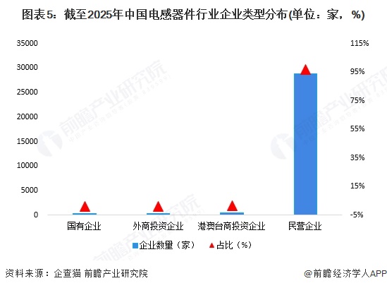 根据企查猫查询数据显示,截至2025年8月,我国电感器件行业民营企业数量最多,共有28856家个体工商户,占比达96.6%。外商投资企业、港澳台商投资企业和国有企业数量分别为322家、416家、278家。总体上看,民营企业是我国电感器件行业发展中最鲜活的血液。