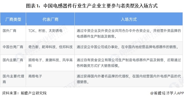 电感器件行业主要参与者多来自日本及中国台湾,村田及TDK是当前全球最大的两家电感供应商。其中,村田在射频电感方面处于主导地位,而TDK及松下则在汽车领域的功率电感具备优势。从国内市场上看,中国台湾厂商中,优势领域为电脑、网络及手机方面的功率电感。国内主要厂商则包括顺络电子、风华高科、麦捷科技等。此外还有一类企业是通过获得代理权经营销售各类品牌电感产品,如商络电子。
