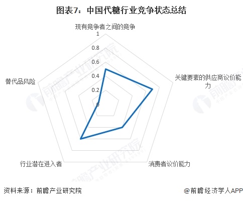 根据以上分析,对各方面的竞争情况进行量化,1代表最大,0代表最小,目前我国代糖行业五力竞争总结如下: