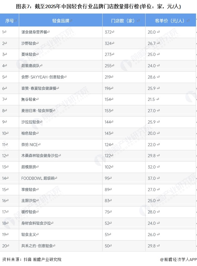 截至2025年8月中国轻食行业品牌门店数量排行TOP5品牌包括:谨食健身营养餐、沙野轻食、蔓味轻食、超能鹿战队以及食野·SAYYEAH·创意轻食。