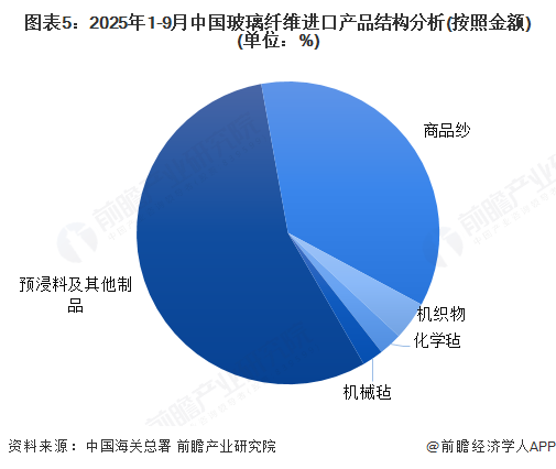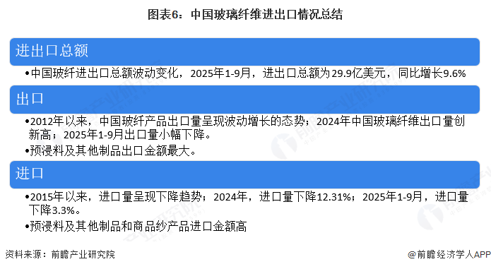 综上所述,近年来,中国玻璃纤维进口量下降,出口量波动上升。从产品角度看,预浸料及其他制品进口金额和出口均最高。进出口总额呈现波动变化趋势,2025年1-9月,进出口总额达到29.9亿美元,增幅为9.6%。