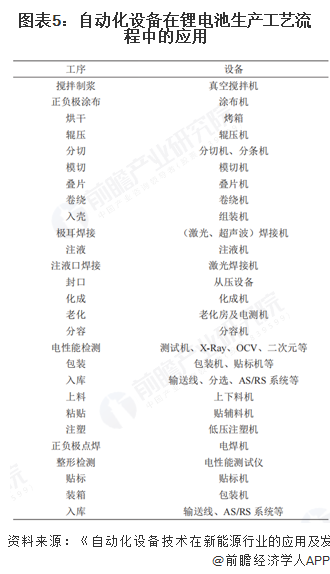 随着现代化科学技术的迅猛发展,自动化设备技术不断完善并被广泛应用于多个生产领域。自动化设备技术能够使自动化器械按照人工要求,在无人参与或者只有少量人参与的情况下自动执行动作,完成指定的工作。自动化设备技术的充分应用能够帮助企业减少人工成本,承担危险和恶劣环境中的工作,保障工作人员的人身安全。自动化设备技术与传统人力工作相比,能够有效提高工作的细致程度、精准程度以及工作效率,降低出错率。由于目前锂电池生产工艺流程较为复杂,因此需要相应的多种设备完成各项工序,且设备专用性较强。自动化设备在锂电池生产过程中的应用现状如下: