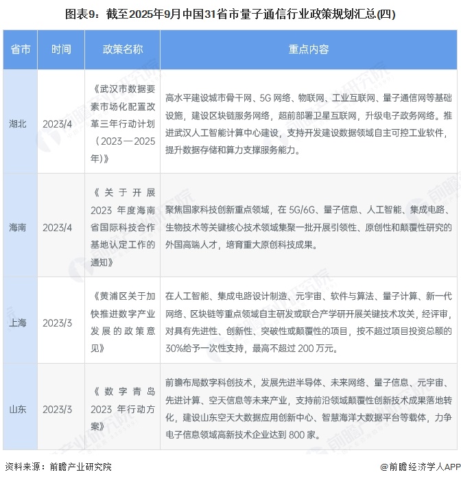 北京、安徽、广东、上海、山东等多个省市在地方科技与信息技术产业发展规划中,对量子信息领域基础科研、应用探索和产业培育等方面做出具体部署,提供政策引导与项目支持。各省市量子通信相关政策和规划汇总如下表所示: