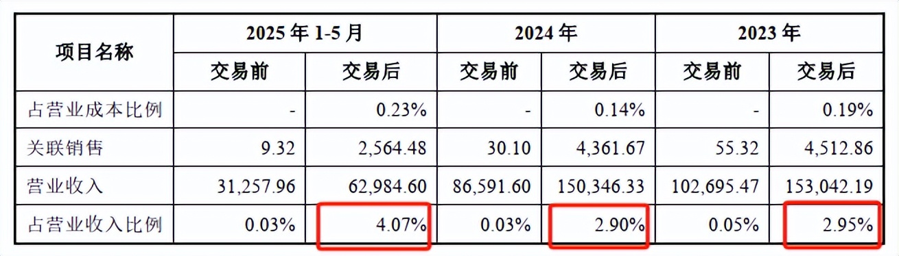 且在此次收购完成后,还将导致上市公司关联方销售收入占比的显著提升。本次交易前,2024年标的公司的关联销售占比仅为0.03%,而交易后其占比则将显著上升至2.90%,2025年1-5月更是将进一步增长至4.07%。而在此次收购与应有利于上市公司减少关联交易的监管要求背道而驰之下,此次收购的必要性存疑的同时,也并不利于保护众多中小股东利益。