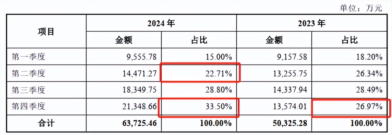 而令人困惑的是,上市公司却表示,除第一季度受春节假期以及下游新能源汽车销量淡季影响导致收入相对较低外,标的公司其余三个季度的收入不存在显著的季节性波动。但在其2024年第四季度的营业收入占比已高出第二季度占比达10.79个百分点的情况下,上市公司却宣称标的公司不存在显著的季节性波动。