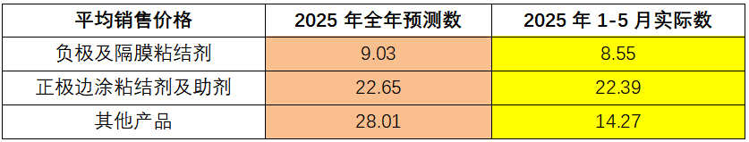且将实际情况与预测数据进行对比,2025年1-5月标的公司各大类产品销售价格的下滑幅度就已经超过了评估机构所预计的全年下滑幅度。其中,负极及隔膜粘结剂、正极边涂粘结剂及助剂的销售单价已分别下滑至8.55元/千克、22.39元/千克,均低于22.65元/千克、22.65元/千克的全年预测数据;其他产品的平均销售价格更是已大幅减少至14.27元/千克,远远小于28.01元/千克的全年测算销售单价、仅只有预测数的约五成水平。