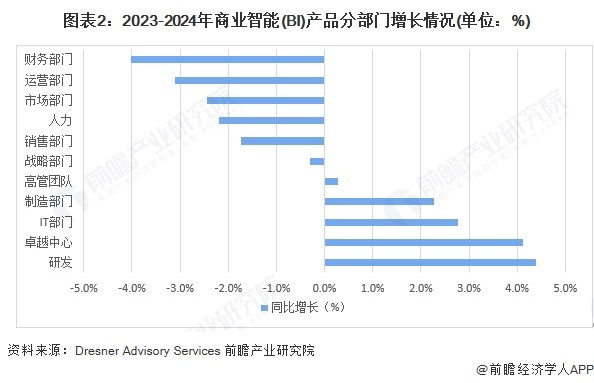 2023-2024年度商业智能市场增长更快的部门包括研发部门、卓越中心以IT部门等,其中使用BI的研发部门用户增长了4.4%。