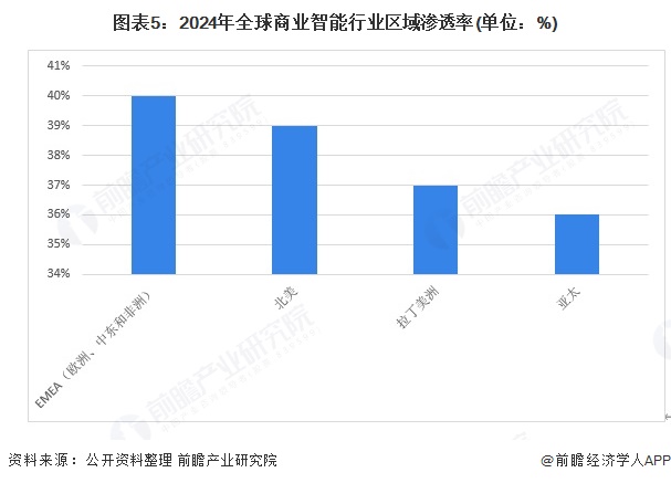 全球商业智能行业在不同区域渗透情况有较大差异,2024年EMEA(欧洲、中东和非洲)的BI普及率最高(40%),其次是北美、拉丁美洲和亚太地区。