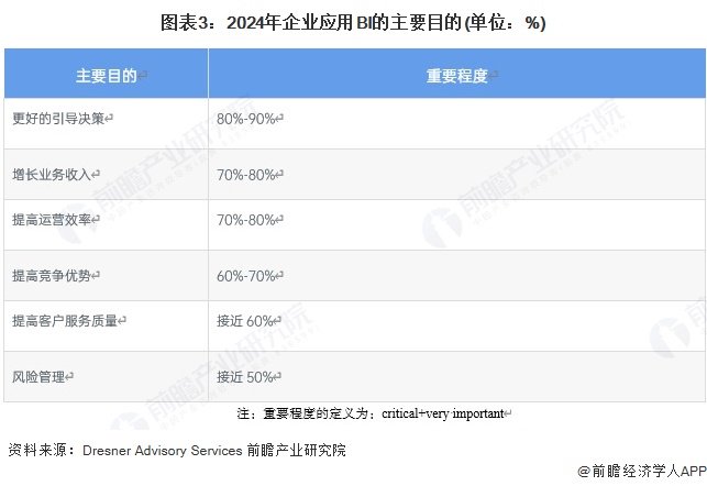 更好的决策引导、增加收入、提高运营效率和提高竞争优势成为企业应用BI的四大主要目的。除此之外,其他目标还包括:提高客户服务质量、实现更高程度的合规和风险管理。