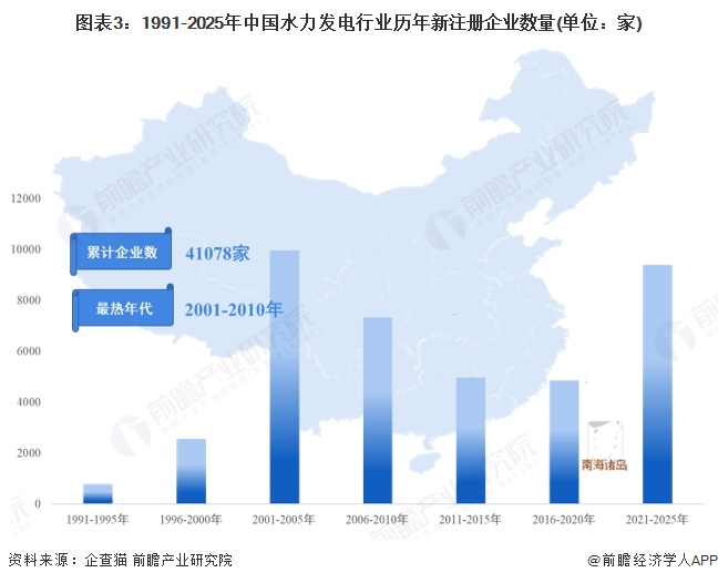 根据企查猫查询数据显示,我国水力发电行业历年新注册企业数量整体呈增长趋势。截至2025年8月,中国水力发电行业累计存续/在业注册企业约4.1万家,2001-2010年新增企业数量较高,该区间内新增企业超过1.6万家。整体来看,水力发电行业在早期进行布局,当前处于稳定运营状态。