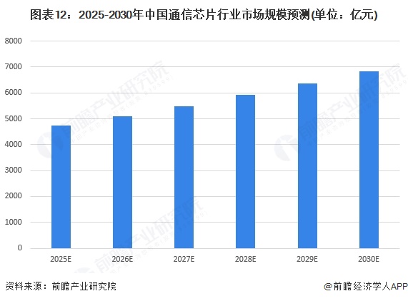 中国通信芯片行业发展前景广阔,正以技术领跑与生态完善开启高质量增长新阶段。6G 领域凭借光电融合芯片等突破性成果,在全频段通信、低时延技术上占据全球优势,华为、中兴等企业专利布局与标准参与度领跑全球。国产替代持续深化,光迅科技、仕佳光子等企业在光芯片、射频器件等领域实现规模化突破,全产业链协同能力不断增强。同时,与 AI、卫星互联网的跨界融合,催生智能工厂、自动驾驶等多元应用场景,叠加政策扶持与市场需求红利,行业将在技术迭代与场景拓展中持续突破,成为全球通信产业创新的核心引擎。整体来看,未来中国通信芯片行业市场规模呈现快速增长趋势发展,初步估计2030年中国通信芯片行业市场规模有望超过6800亿元,年均复合增长率为7.6%。