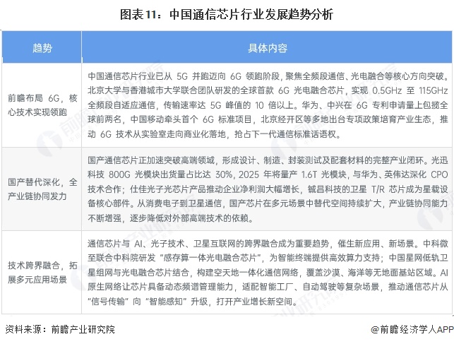当前中国通信芯片行业呈现 6G 领跑、国产替代深化、跨界融合拓展的核心趋势。依托技术突破、政策支持与产业链协同,行业不仅在 6G 标准与核心技术上占据全球优势,更在高端产品替代与多元场景应用中持续突破。尽管仍面临部分技术瓶颈,但整体正从规模扩张向高质量发展转型,为数字经济与智能产业升级提供坚实支撑。