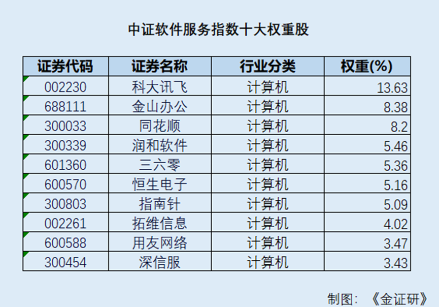 截至2025年11月20日,中证软件服务指数的前十大重仓股为科大讯飞、金山办公、同花顺、三六零、润和软件、恒生电子、指南针、拓维信息、用友网络、深信服。