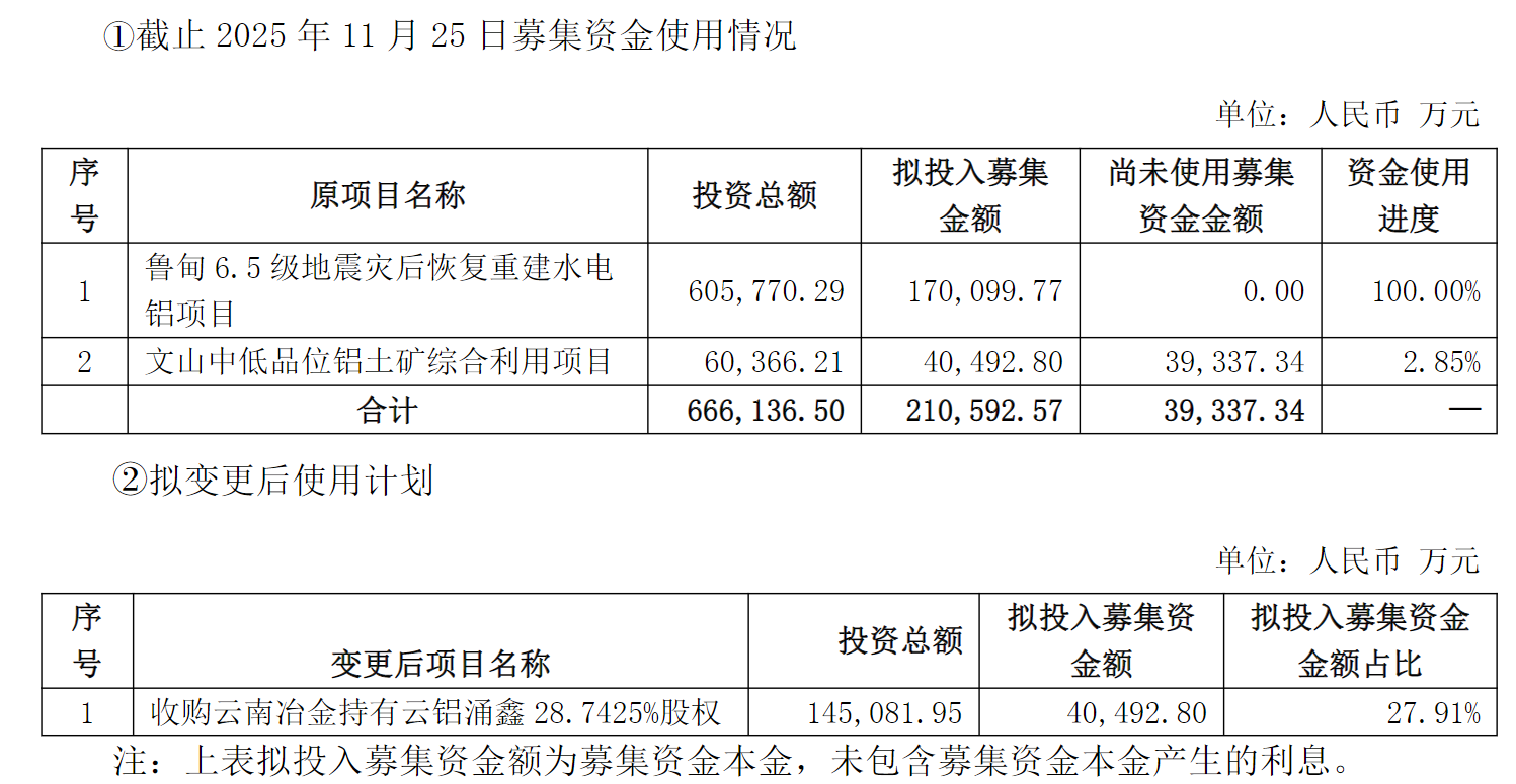 在资金安排方面,云铝股份拟将"绿色低碳水电铝材一体化项目"节余募集资金6.25亿元(含利息)以及"文山中低品位铝土矿综合利用项目"募集资金4.18亿元(含利息)变更用途,用于收购云铝涌鑫28.7425%股权。其中对于文山项目已投入的1155.46万元,公司将用自有资金进行置换。