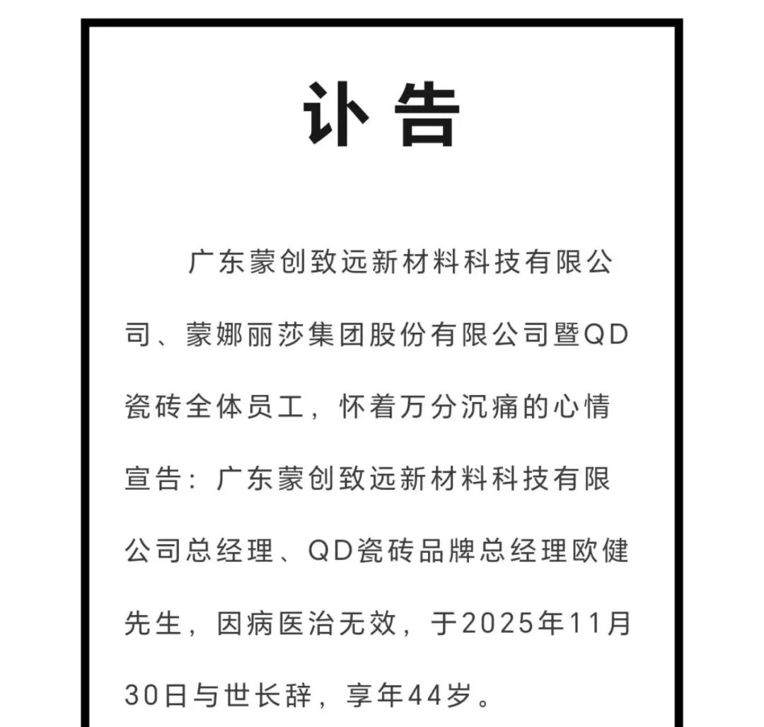 广东蒙创致远新材料科技有限公司总经理、QD瓷砖品牌总经理欧健因病医治无效,于2025年11月30日去世,享年44岁。