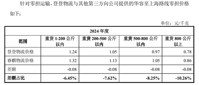 另外,对于零担运输,登登物流与其他第三方向公司提供的华容至上海路线零担价格显示,华容至上海运输路线,关联方登登物流与第三方睿麒物流的价格整体相差6%-10%左右,登登物流的价格略低于睿麒物流。