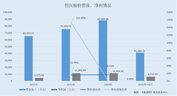2022-2024年,恒兴股份营业收入分别为6.52亿元、7.55亿元、8.79亿元,2023-2024年营业收入分别同比增长15.75%、16.41%。同期,恒兴股份净利润分别为4,473.46万元、11,303.99万元、11,344.56万元,2023-2024年净利润分别同比增长152.69%、0.36%。