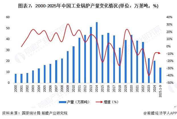 从我国工业锅炉供给状况看,工业锅炉产量变化可分为两个时间阶段:一是从2000-2014年,工业锅炉产量逐年上升,2014年产量达到峰值,工业锅炉产量达55.81万蒸吨;二是2015至今,即“十三五”以来,全国工业锅炉年产量(以蒸吨数计)在波动中整体逐年呈下降趋势。2024年,我国工业锅炉产量达20.38万蒸吨,2025年1-9月,我国工业锅炉产量达13.94万蒸吨。