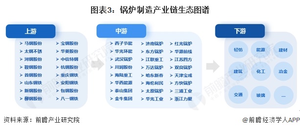 中国锅炉制造产业的上游主要为原材料与辅助设备生产商;中游包括锅炉制造生产环节,包括工业锅炉与电站锅炉;下游则包括轻纺、能源、冶金、化工等行业。