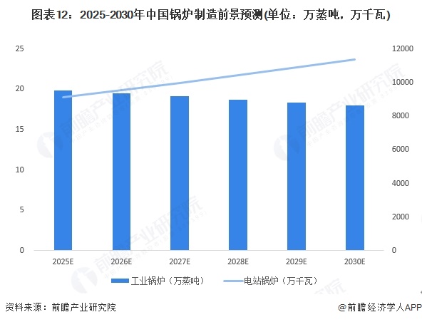 近年来,我国工业锅炉行业继续绿色发展,行业整体面临的转型升级压力较大,随着落后产能的逐步淘汰,保守预计2025-2030年,我国工业锅炉产量将以1%-4%下跌,若以2%计算,到2030年,产量约18万蒸吨;电站锅炉作为火电行业的核心装置之一,其未来发展与下游发展前景紧密相连。初步假设电站锅炉未来市场年均复合增长率与火电市场新增装机容量年均复合增长率(4.60%)相同,则到2030年,电站锅炉市场规模可超过100吉瓦。