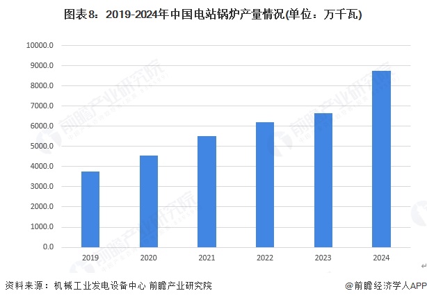 机械工业发电设备中心数据显示,2019-2021年,中国电站锅炉产量逐年上升,中国电站锅炉产量从2019年的约3751.8万千瓦上升至2021年的5504.7万千瓦,同比上升20.83%。截至2024年底,电站锅炉产量8748.5万千瓦,同比增长31.8%。