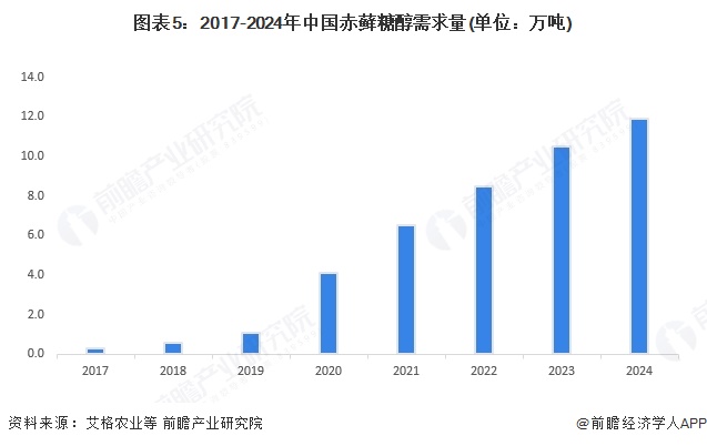 2017年以来,随着元气森林无糖气泡水等产品推出市场,中国赤藓糖醇需求量呈现爆发式增长。2019年和2020年中国赤藓糖醇需求量增速均超过100%。2024年中国赤藓糖醇需求量约达到11.9万吨。