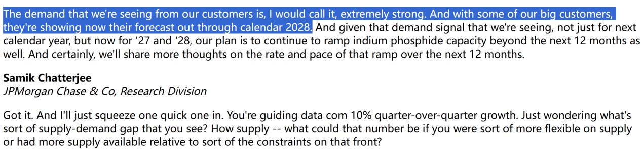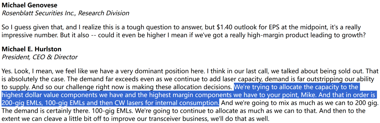 一方面,根据老馒头FY2026Q1的Earnings call,在产能严重不足的背景下,老馒头将优先按照毛利率高低的方式对产能进行分配,顺序是:200G EML优先于100G EML优先于CW。