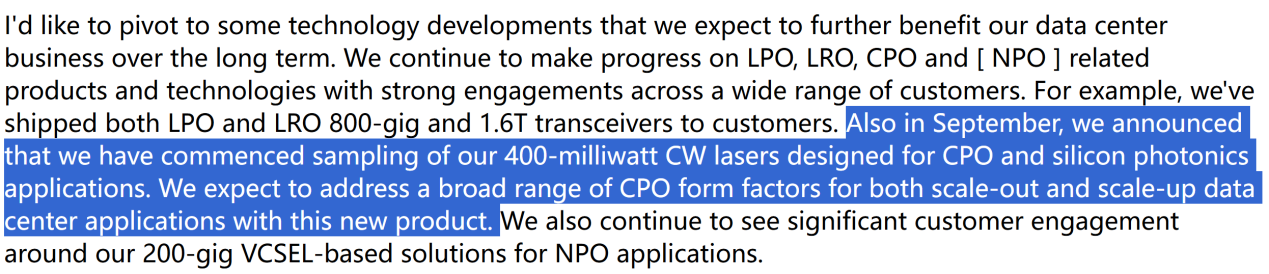 另一方面,根据相干公司FY2026Q1的Earnings call,公司已在今年9月宣布已开始对专为 CPO和硅光子应用设计的400毫瓦CW激光器进行送样,公司期望通过这款新产品解决广泛的CPO规格,涵盖Scale out和Scale up数据中心的应用。而老馒头同样在FY2026Q1的Earnings call中表示,CPO的需求强于最初预测,客户参与度大大增加,2026年下半年CPO的营业收入会有很大提升。
