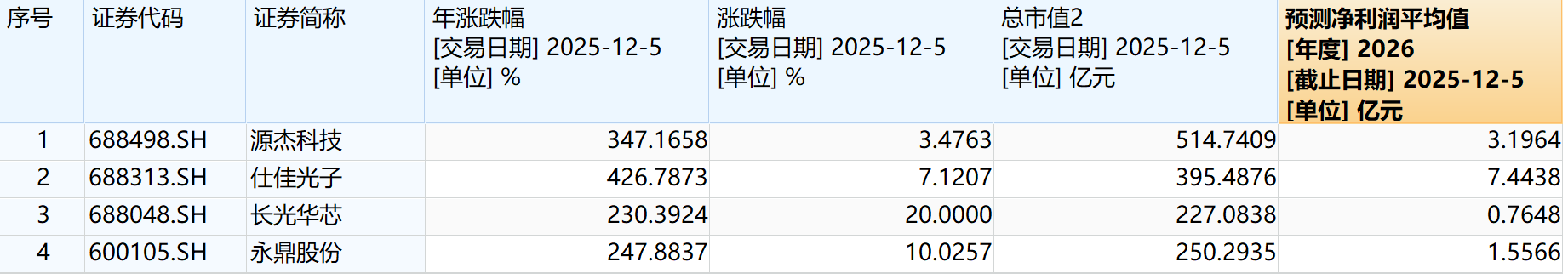 受北美AI基建浪潮以及老馒头(Lumentum.US)和相干公司(Coherent.US)的乐观表述驱动,近期以源杰科技(688498.SH)、仕佳光子(688313.SH)、长光华芯(688048.SH)、永鼎股份(600105.SH)等为代表的国产光芯片上市公司纷纷大涨。从年初到2025年12月5日收盘,这四家公司股价涨幅最低的超过了200%,股价涨幅最高的甚至超过了400%。