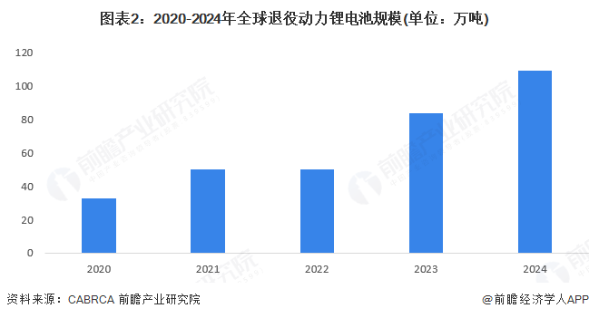 全球动力电池退役规模随着全球新能源汽车行业的发展而发展,2023年全球动力电池退役规模达到84万吨,2024年在109万吨左右。