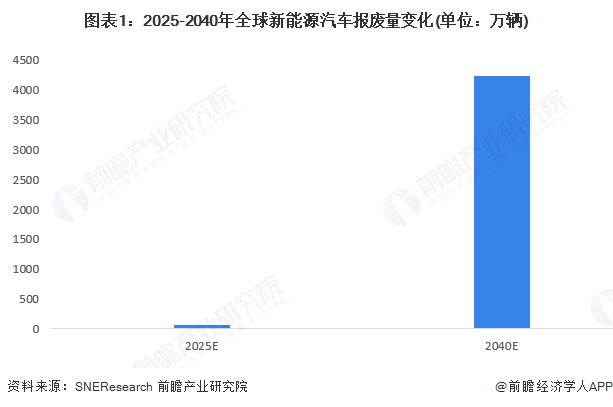 近年来,全球新能源汽车发展迅速,汽车产销量和保有量大幅增长。新能源汽车的使用年限一般为10年,早期新能源汽车主见进入报废阶段。2024年全球电动汽车报废量较小。SNEResearch分析师预测,全球电动汽车报废数量将从2025年的56万辆增加到2040年的4227万辆。
