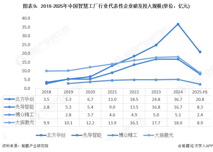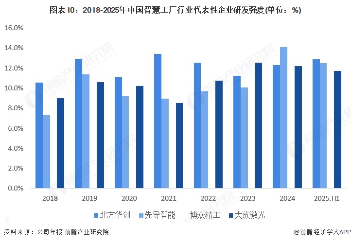 2018-2025年上半年,四家企业科研投入强度均处较高水平且各有特点:北方华创始终稳定在10.6%-13.4%高位;先导智能从7.3%逐步升至14.1%后微降;博众精工初期13.4%-14.3%领先,中期回落至10.3%左右,2025年H1回升至12.6%;大族激光整体波动小,多在9.0%-12.5%区间。整体而言,中国智慧工厂行业代表性企业研发强度维持在10%-12%的区间。