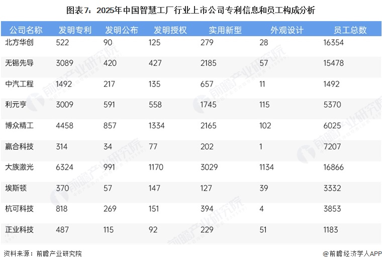 从智慧工厂行业的上市企业已有的公开信息分析,专利信息相对较多的企业是大族激光,其中发明专利6324条。员工总数最多的也是大族激光,员工总数为16866人。