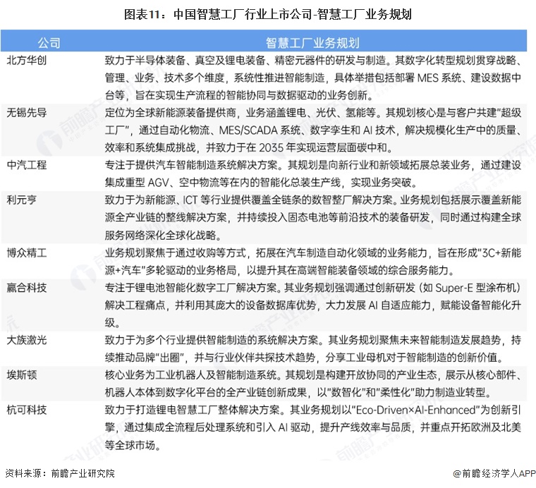 当前,为把握制造业智能化升级与高端化转型的战略机遇,智慧工厂行业上市公司正积极构建各具特色的业务布局。其中,北方华创深耕半导体装备领域,强化基础产品研发;无锡先导推进全球化布局,提供从单机到整线的数字化工厂解决方案;利元亨则聚焦新能源行业,打造覆盖全链条的数智整厂方案。此外,大族激光构建多工厂运营网络强化系统解决方案能力,杭可科技加速海外工厂建设拓展全球市场,各企业正通过差异化布局在细分领域构建核心竞争力。