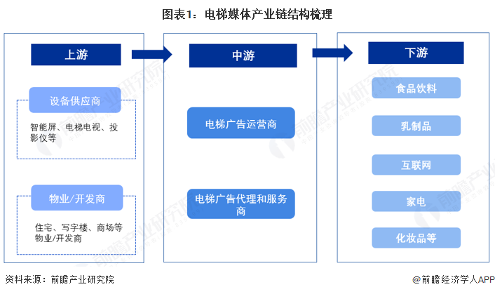 中国电梯媒体行业产业链上游为硬件设备供应商和物业开发/管理公司;中游主体为电梯媒体运营企业;下游主体为各行业客户。