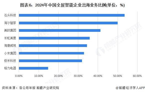 从代表性企业出海业务比例对比情况来看,石头科技重视出海业务,其海外业务占比较高,达到53.48%,海尔智家排名第二,国外业务占比49.97%。美的集团、长虹美菱、海康威视等海外业务均超过30%。整体来看,对于全屋智能行业相关企业,海外业务是相当重要的市场。