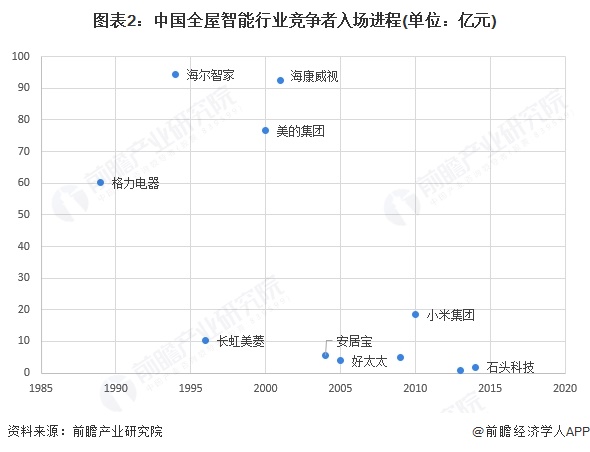 从中国全屋智能行业竞争者入场进程来看,格力电器自20世纪90年代以前最早进入全屋智能行业;其他企业布局进入全屋智能行业的时间较多集中在2005年前后。从注册资本规模来看,海康威视和海尔智家注册资本相对较高,均超过90亿元。
