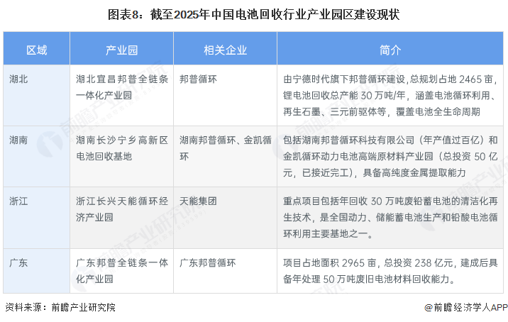 目前,中国电池回收行业相关产业园区的建设主要集中湖北、湖南、浙江、广东等省份,相关企业包括邦普循环、天能集团等,涵盖电池循环利用、电池材料生产等。