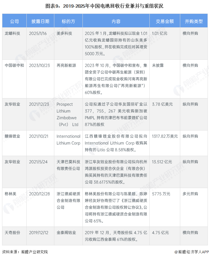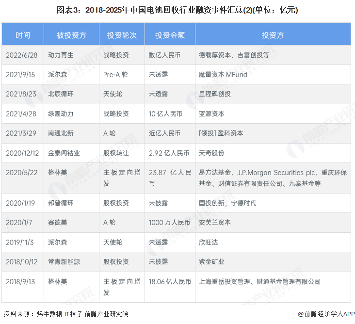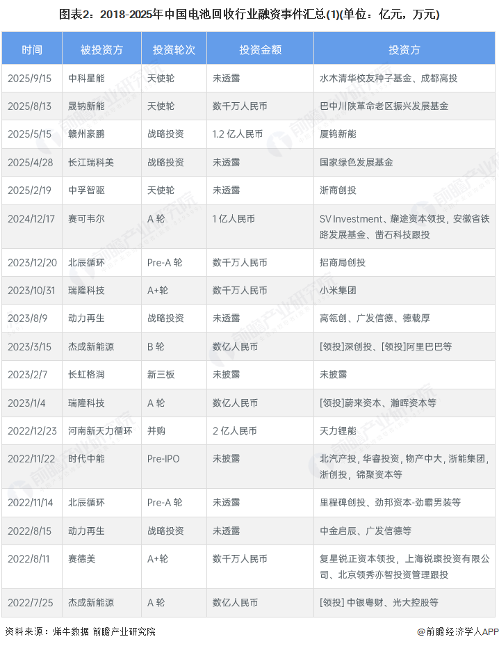 (原标题:【投资视角】启示2025:中国电池回收行业投融资及兼并重组分析(附投融资事件、产业园区和兼并重组等))